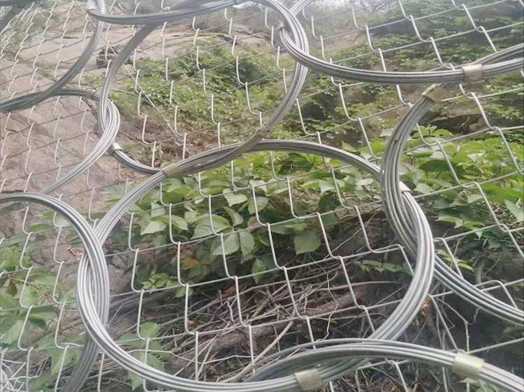 環(huán)形被動防護網(wǎng)又稱為ROCCO環(huán)形網(wǎng),是由數(shù)股鋼絲盤結(jié)成環(huán)形相互套接而形成的被動攔石網(wǎng),采用熱鍍鋅工藝。在落石沖擊過程中能發(fā)生自身幾何形態(tài)改變,具有更為突出的柔性特征,能夠?qū)崿F(xiàn)高3000kJ以上動能的落石阻攔。并且能進一步簡化結(jié)構(gòu)形式(如支撐繩和減壓環(huán)的配置),方便局部受損后的維護修復(fù),ROCCO環(huán)形網(wǎng)已經(jīng)成為一種替代鋼絲繩網(wǎng)系統(tǒng)的新型攔石網(wǎng)(RXI型),實現(xiàn)了SNS被動防護系統(tǒng)的更新?lián)Q代和升級。